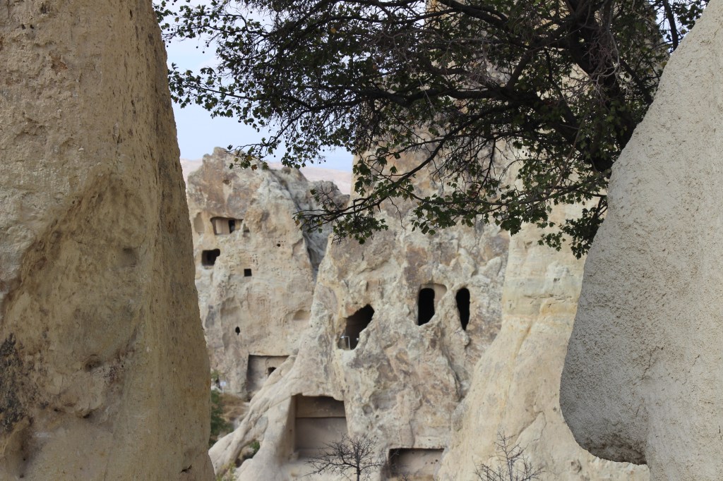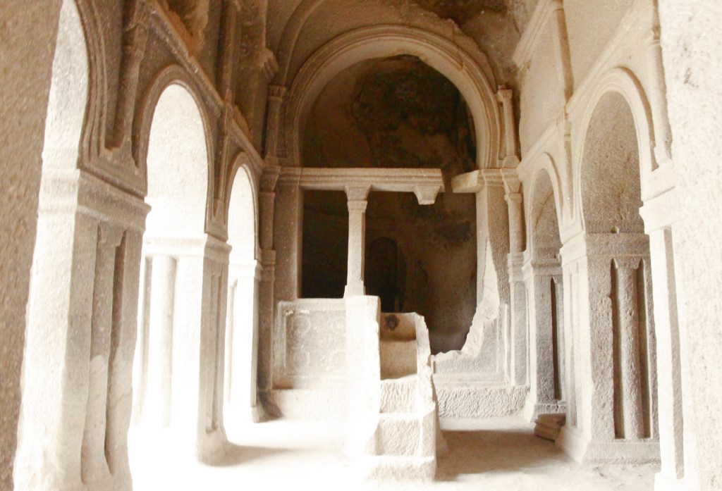 Bölgeyi gezmeye, adetimiz olduğu üzere, Kapadokya’nın kalbi sayılan Göreme ile başlıyoruz. Buraya gelenlerin ilk gittiği yer, Unesco Dünya Mirasları arasında yer alan Göreme Açık Hava Müzesi. Hristiyanlık dininin ilk temel öğretilerinin oluşturulduğu ve manastır yaşamının temellerinin atıldığı yer tam da burası. Bloklara oyulmuş kiliseler, şapeller, mutfaklar, yemekhaneler, mezarlar ve o dönem hakkında bilgi veren birçok detay, eşine rastlanmayacak türden. Hemen müze girişinin solundaki ilk yapı Rahibeler Manastırı ve karşısında Rahipler Manastırı bulunuyor. Her ikisi de birer kaya kütlesine çok katlı olarak oyulmuş ve 11. Yüzyılda yapılmış oldukları düşünülüyor. Yıkıntılar sebebiyle önceden en azından ilk katları gezilebiliyordu ama da şu günlerde ikisi de tamamen kapalılar. Yine girişte karşınıza çıkan Aziz Basil Şapeli de 11. Yüzyıla tarihleniyor. Sütunlarla ayrılan bölümde mezar çukurları var ve hatta bazılarında iskeletler de teşhir ediliyor. Ana bölümde Hz. İsa portresi, Meryem ve çocuk İsa, karşılıklı duvarlarda at üzerinde Aziz Theodore ile yine at üzerinde Aziz George tasviri yer alıyor. Sonrasında girdiğimiz Elmalı Kilise 11. Yüzyılın ortasına tarihleniyor ve freskleri nispeten iyi korunmuş durumda. Duvarlarda Hz. İsa’nın hayatıyla ilgili 15 sahne resmedilmiş. Kilisenin ismini, Mikail’in elinde bulunan nesnenin elmaya benzemesinden ya da yakınındaki bir elma ağacından aldığı düşünülüyor. Özenli mimarisiyle Azize Barbara Şapeli de 11. Yüzyıl özellikleri taşıyor. Kırmızı boya ile doğrudan kayaların üzerine yapılmış zengin geometrik desenler, mitolojik hayvan figürleri ve askeri semboller karmaşık bir kompozisyon gibi görünüyor ve ikonoklast dönemi işaret ediyor. Ana bölümde Hz. İsa, diğerlerinde ise Azize Barbara, Aziz George ve Aziz Theodore tasvirleri yer alıyor. Yine bölgenin 11. Yüzyılda yapıldığı düşününlen bir diğer kilisesi, tamamlanmamış Yılanlı Kilise. Adını, resmedilen Aziz George ve Aziz Theodore’un savaştığı ejderin yılana benzetilmesinden dolayı almış olabilir. Aynı tarafta haçı tutan Helena ve oğlu Konstantin resmedilmiş. Karşı tarafta ise çıplak ve kadın göğüslerine sahip olarak tasvir edilen Aziz Onuphrius bulunuyor ve önünde bulunan figür yılana benzediği için de kilise bu ismi almış olabilir. Karanlık Kilise ise adını, sadece küçük bir pencereden ışık aldığından ve zor ulaşıldığından almış olmalı ki 11. Yüzyıldan bu yana bölgenin en iyi korunmuş kilisesi olarak kalmış. Bu yüzden canlı renkleriyle detaylı freskleri, içeriye girince adeta görsel bir şölen havası yaratıyor. Açıkhava Müzesine giriş bileti bu kilise için geçerli değil, ayrıca bilet almak gerekiyor. Çarıklı Kilise ise 11. Yüzyılın sonuna tarihlenmekte ve Hz. İsa’nın hayatı ile ilgili 12 sahne resmedilmiş. İsmini, göğe yükseliş sahnesinin altında bulunan ayak izlerinden aldığı düşünülüyor. Karanlık Kilise ile Çarıklı Kilise arasında Azize Catherine Şapeli yer alıyor fakat bu gidişimizde kapalıydı.